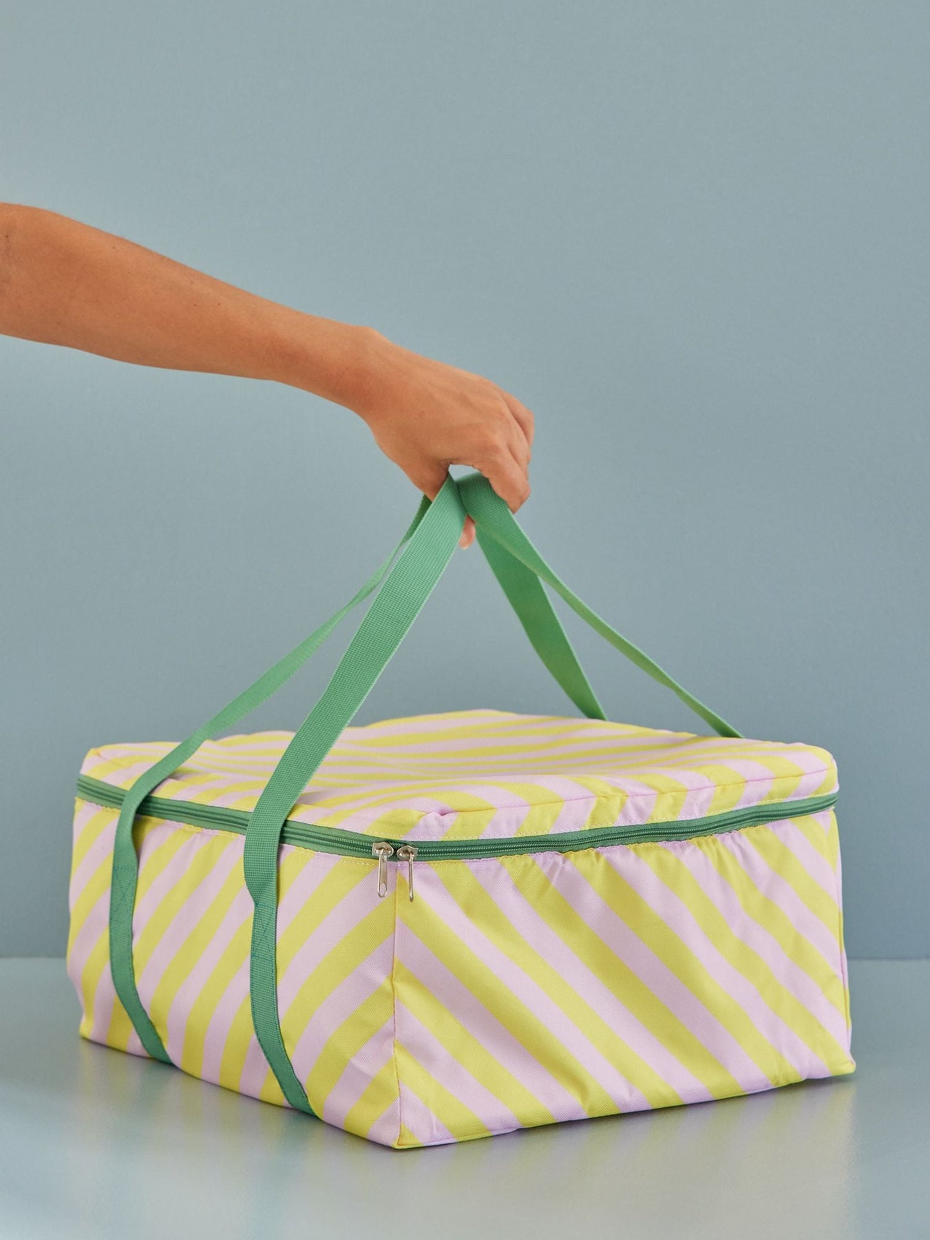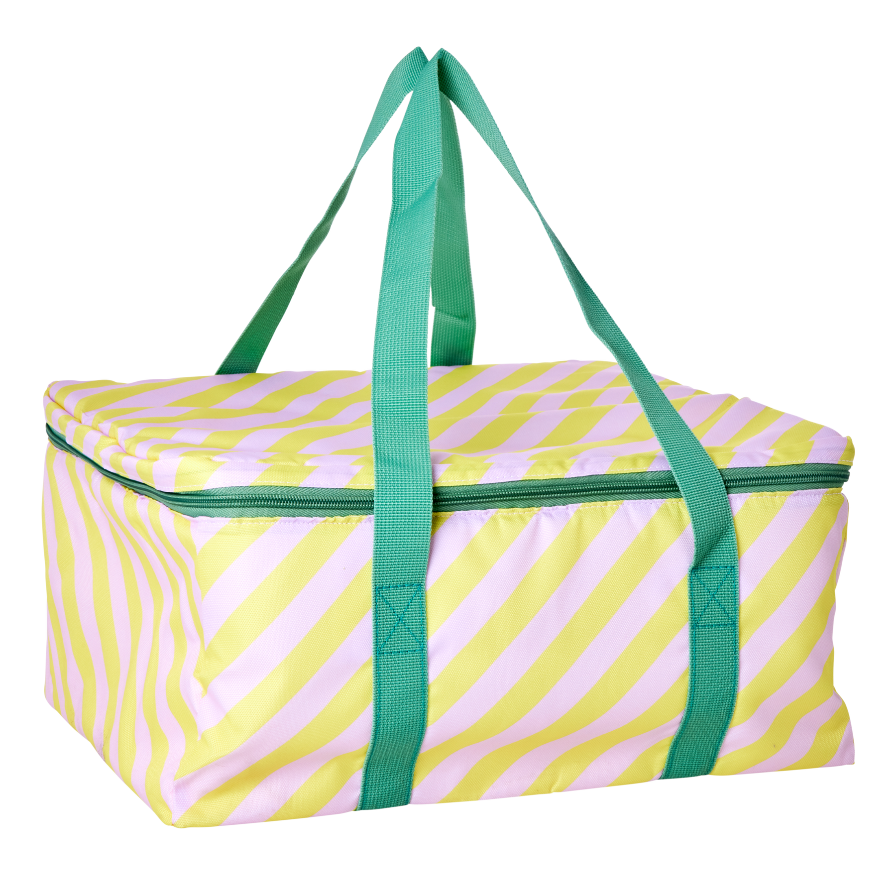 Hold dine drinks og madvarer kolde med denne super cool køletaske! Vi elsker at være kreative med former og farver – og denne taske er ingen undtagelse! De sjove og farverige striber gør den perfekt til en sommerlig picnic eller road trip. Stropperne rundt om tasken gør den nem at bære, så du uden besvær kan tage den med på stranden, til parken eller i skoven. Du kan altid finde mere information om vores materialer på vores hjemmeside under ”Oplev RICE” og ”produktinformationer”. *Produktbeskrivelser og -information er med forbehold for fejl og mangler, ændringer, udsolgte eller udgåede varer.