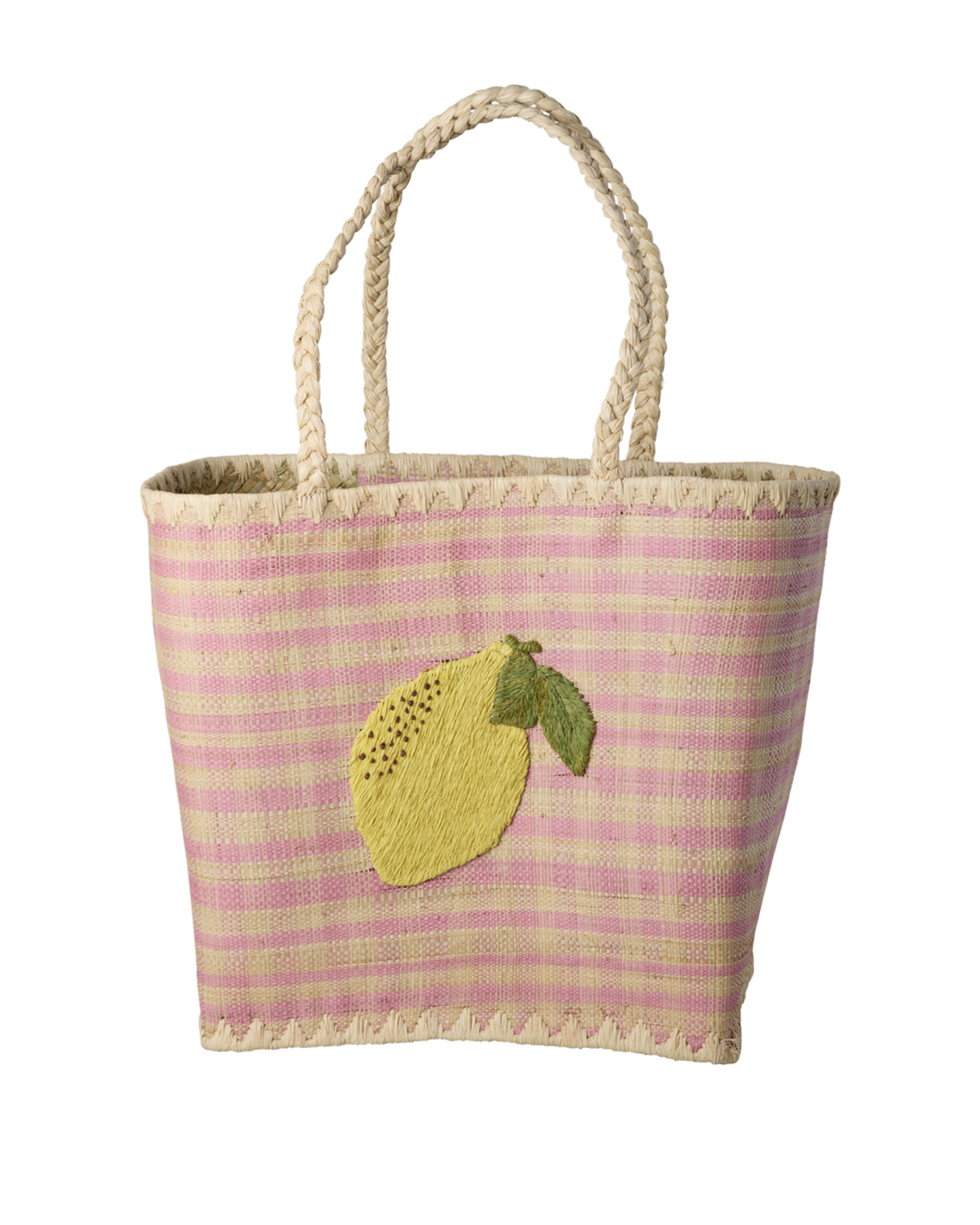 Gorgeous and fun bag with pink checkers, a lemon and braided handles... made of the natural material raffia. A little pocket keeps the most important things safe and organized inside the bag. Use it for picnics, on the beach, as a weekend bag, or whatever the day has to offer.