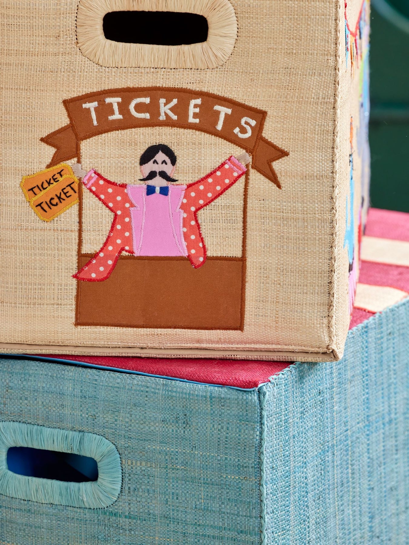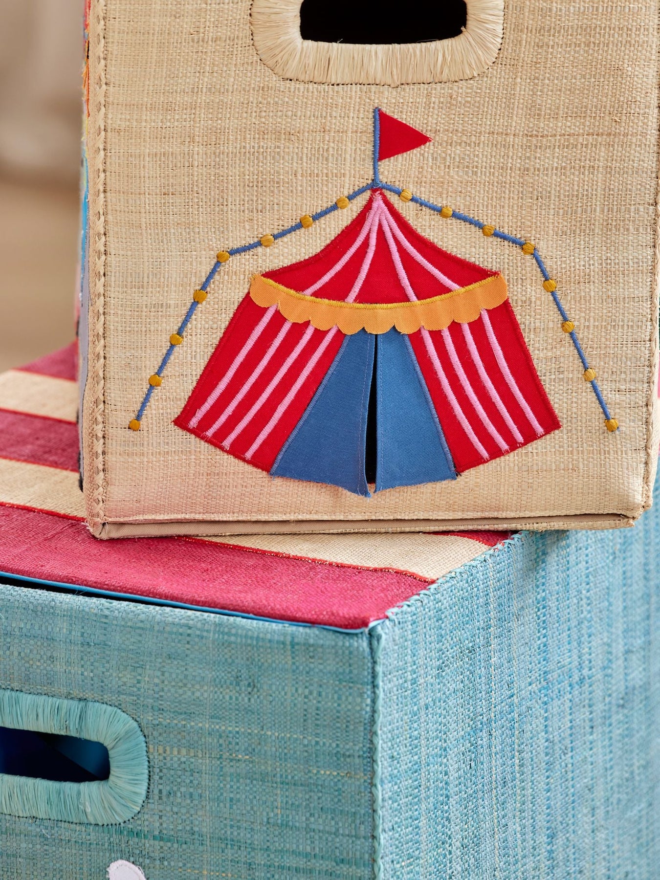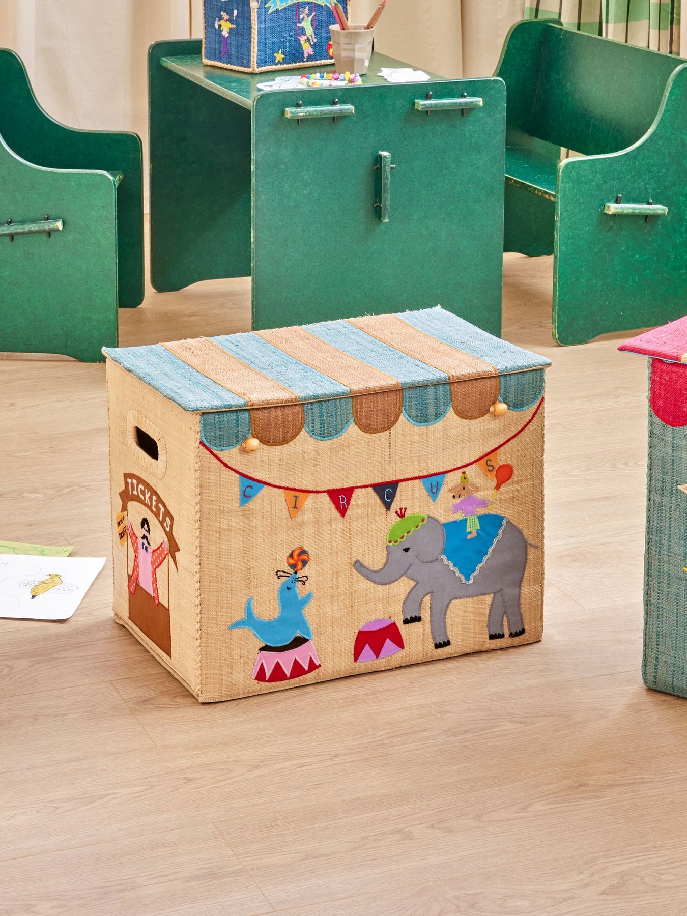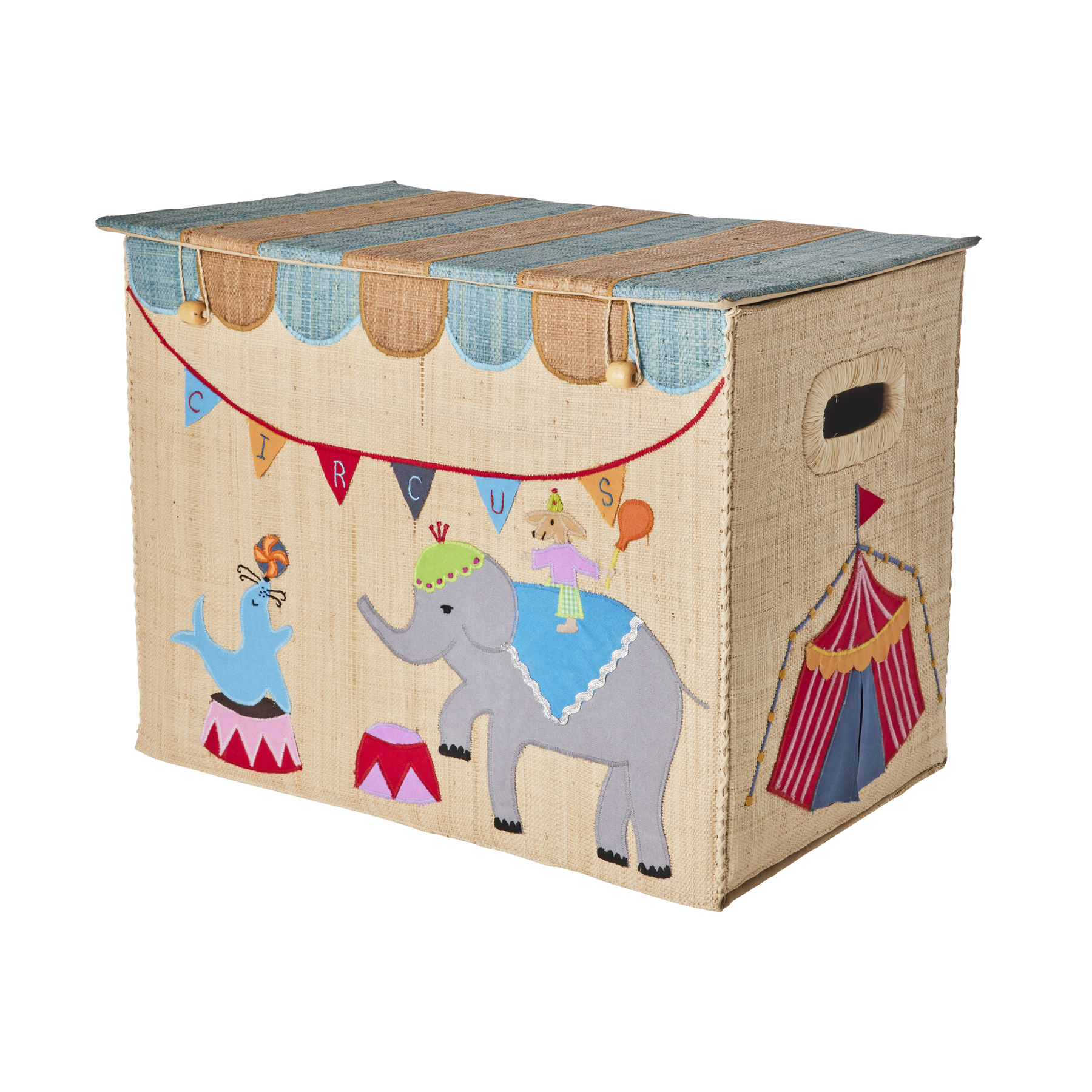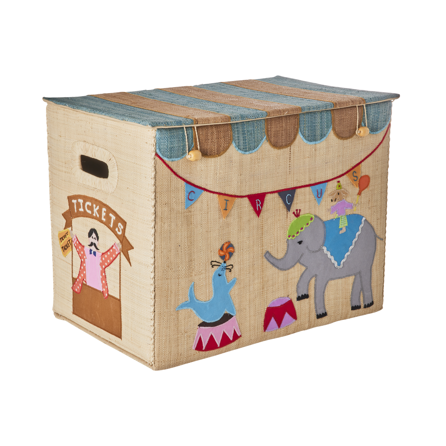 Auf geht’s zum Zirkus! Diese große Aufbewahrungsbox aus Raffia mit Zirkusmotiv ist nicht nur eine tolle Ergänzung zum Spielen, sondern auch super praktisch! Sie hat an beiden Seiten einen Griff und einen Deckel, sodass du alle kleinen und großen Dinge des Alltags verstauen kannst … ach ja, und faltbar ist sie auch noch!