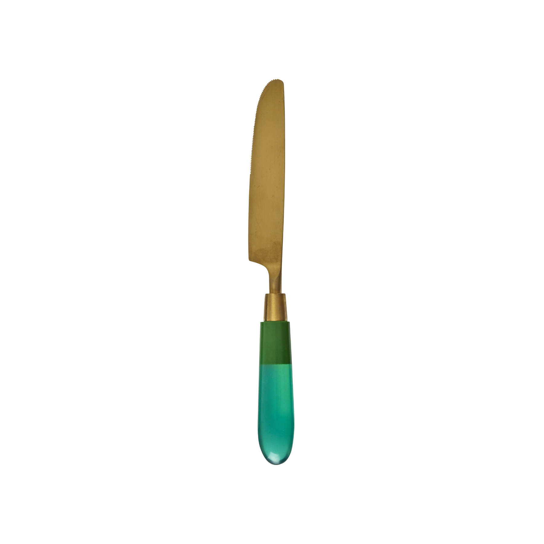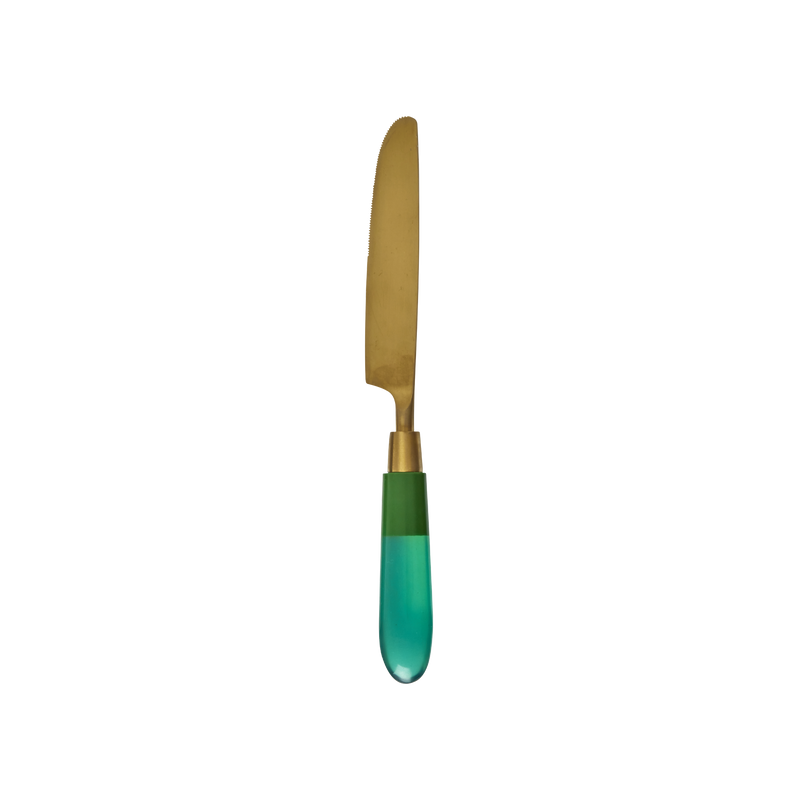 Un magnifique couteau aspect laiton, avec un manche translucide vert. À utiliser pour les pâtes à tartiner ou le fromage le matin, ou pour un dîner chic… laissez-vous inspirer ! Existe aussi en rose et en bleu. Pssst… nous avons la fourchette et la cuillère assorties !