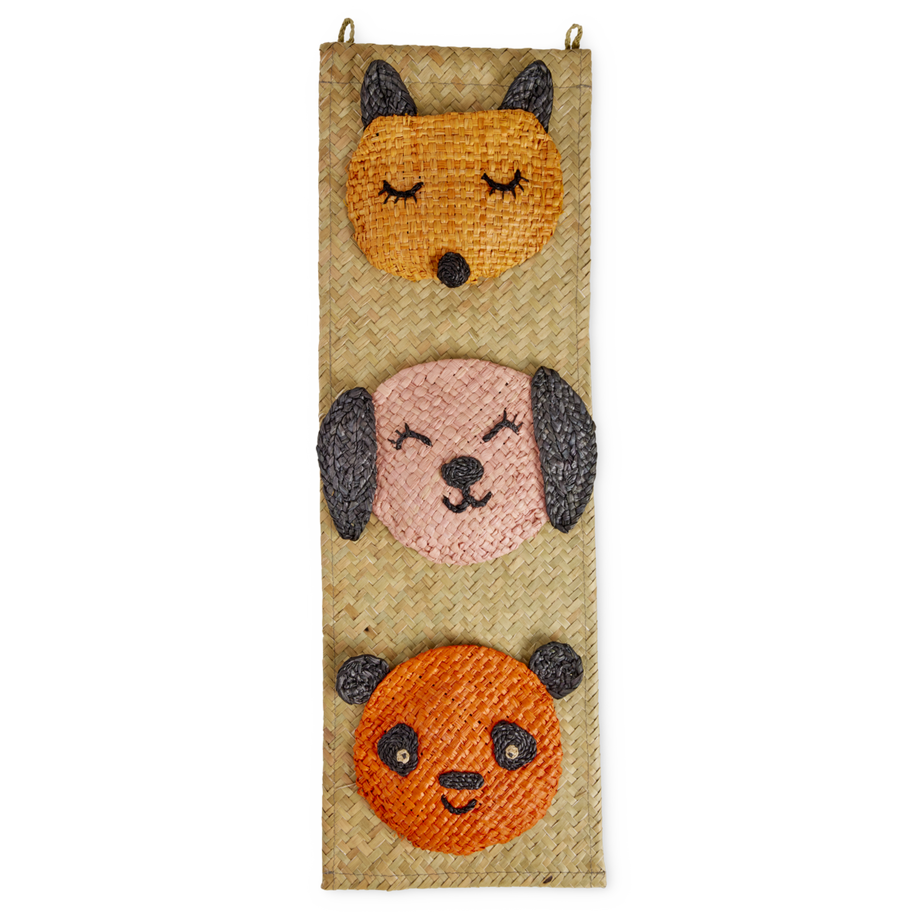 Décorez la chambre des enfants avec cette adorable patère verticale et ses têtes d’animaux. Elle est fabriquée à la main en raphia, un matériau naturel et durable, et les têtes d’animaux sont en fait de petites pochettes secrètes… parfaites pour les petits jouets, les fournitures d’arts plastiques ou les doudous.