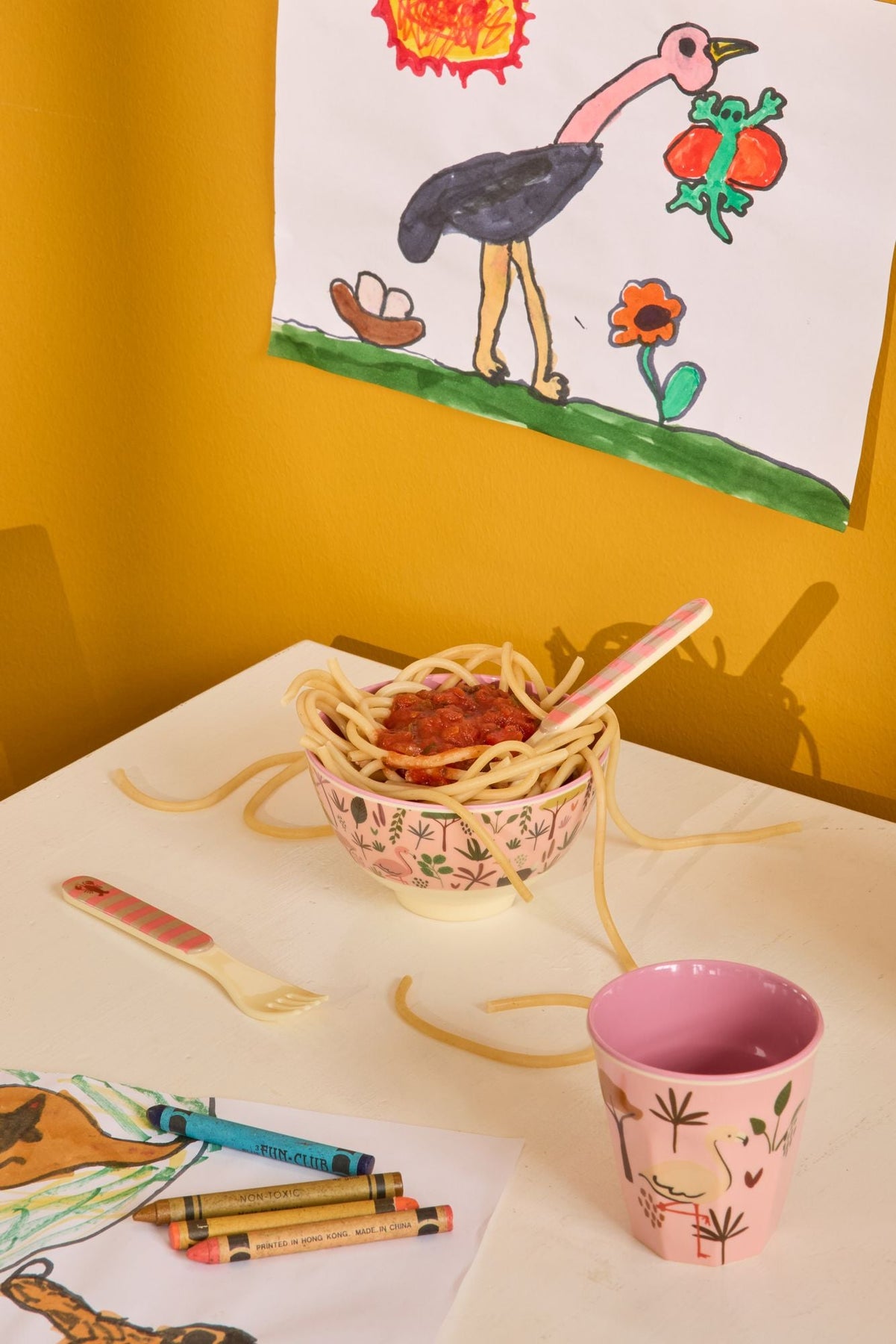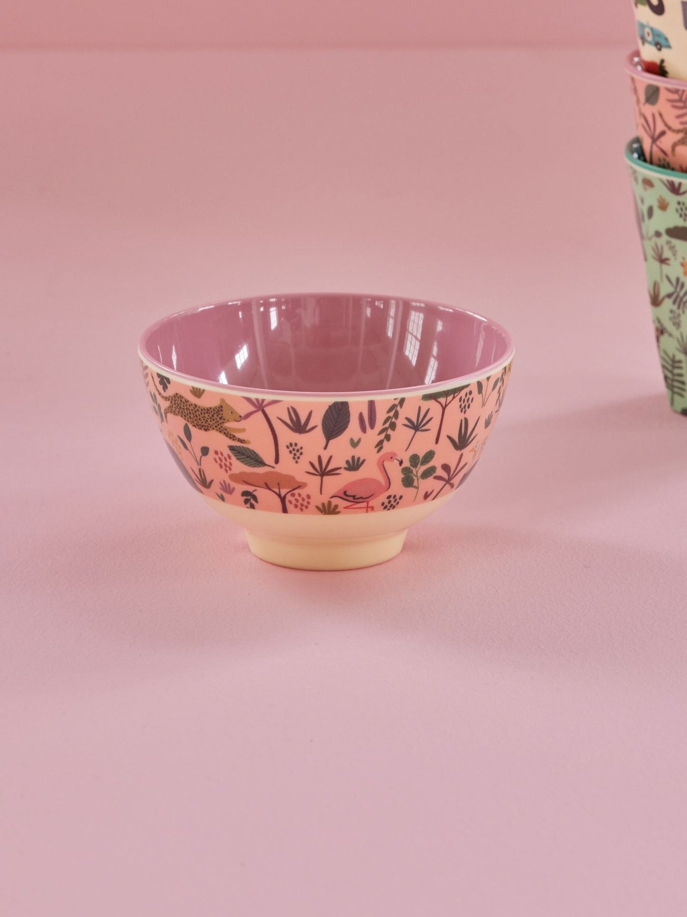 Adorable bol en mélamine, petite taille, imprimé « All Over jungle Print » avec des animaux de la jungle sur fond corail. L’intérieur est coloris vieux rose. Ce bol est parfait pour les céréales du matin, la soupe, une petite fleur ou des bonbons. Profond et facile à utiliser pour beaucoup de choses, dedans comme dehors… Il s’adapte à tous vos besoins !