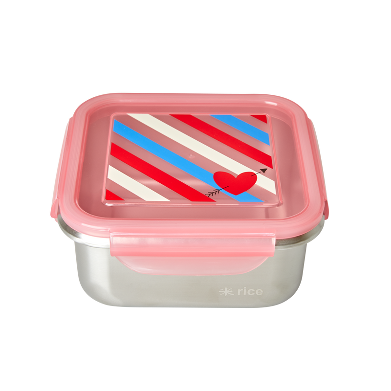 Porta pranzo in acciaio inossidabile - forma quadrata con coperchio rosa e deliziose righe. La base del porta pranzo è adatta al congelatore e può essere lavata in lavastoviglie solo nel cestello superiore - il coperchio NON è lavabile in lavastoviglie. Si prega di notare che il porta pranzo non è adatto al microonde.