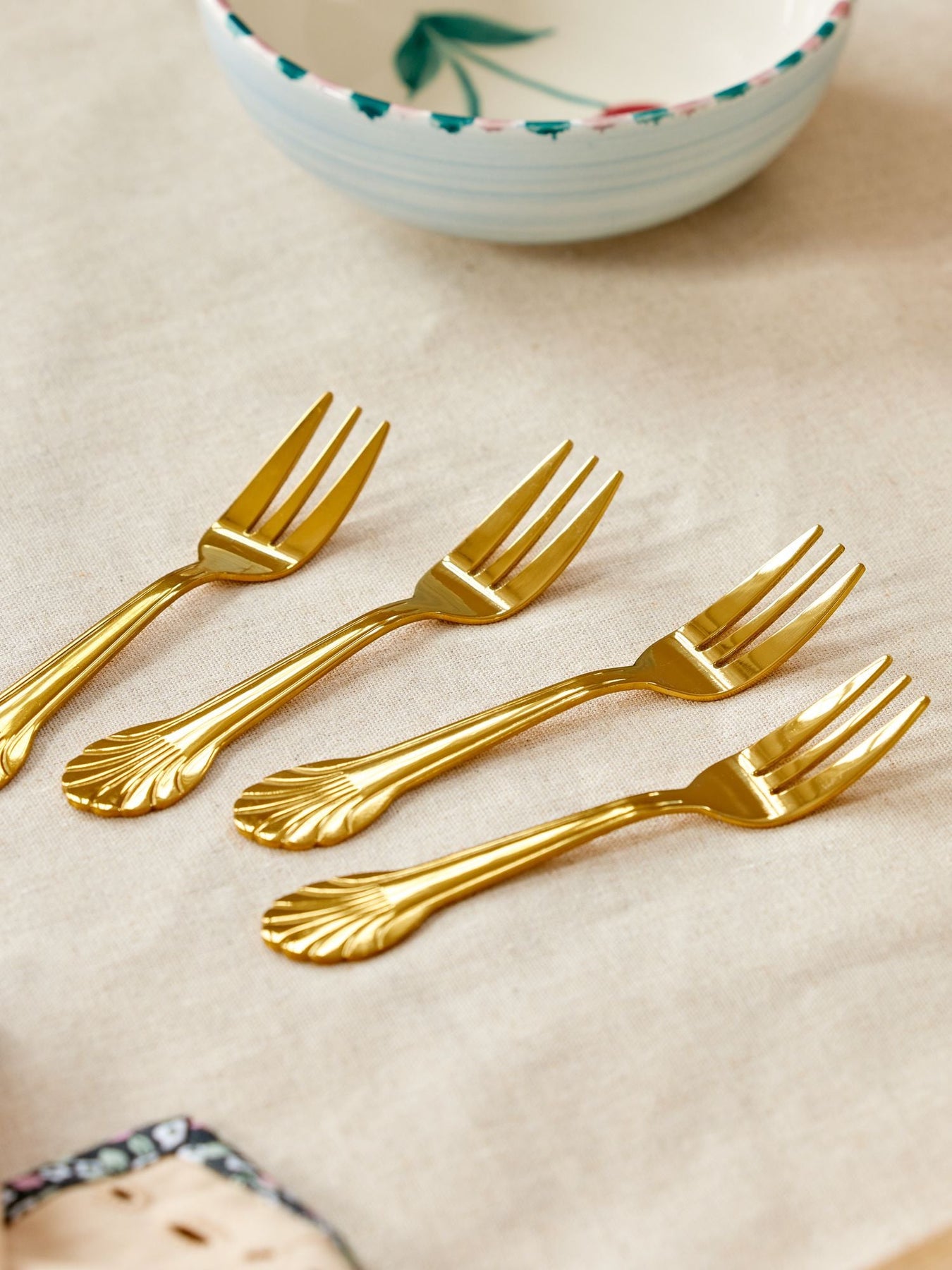 Creëer een magische tafelschikking met deze prachtige gouden schelpenvorkjes - voor iedereen die elke dag een beetje magie wil! Ze zijn niet alleen mooi, maar ook super praktisch en bruikbaar. Gebruik ze als taartvorkjes bij je komende verjaardagsfeestje, om te serveren bij een tapasavond of neem ze mee op een picknick ... de mogelijkheden zijn eindeloos! Na verloop van tijd zal het goud een beetje vervagen en dit proces zal sneller gaan als je ze in de vaatwasser wast.