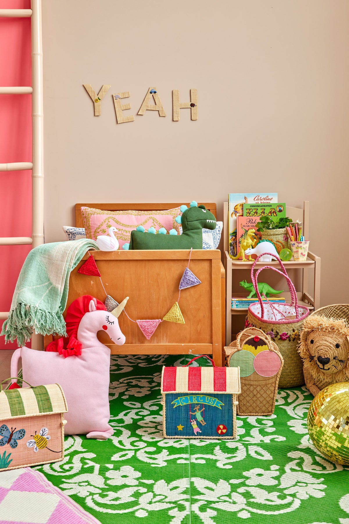 This product is handmade in the amazing natural material, raffia. Raffia fibers come from palm fronds and all RICE raffia products come from Madagascar, which also is the place where the history of RICE began. Our raffia baskets and raffia houses were some of our very first products. The production takes place in two villages in the mountains of Madagascar and supports more than 300 families on the Red Island.