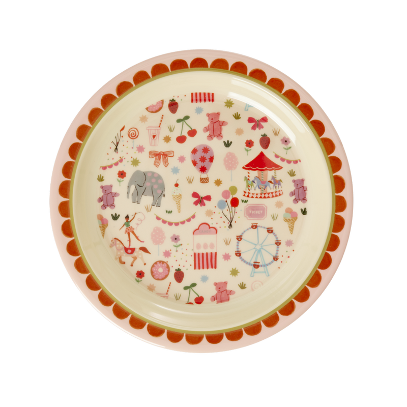Melamine lunch plate for kids with a cute fun fair theme in pink shades. Melamine is durable and ideal for daily use due to its strength and easy cleaning. It doesn't absorb color or taste from food and the practical edge will help the food stay on the plate. It is cool, practical, and a perfect fit for every meal!