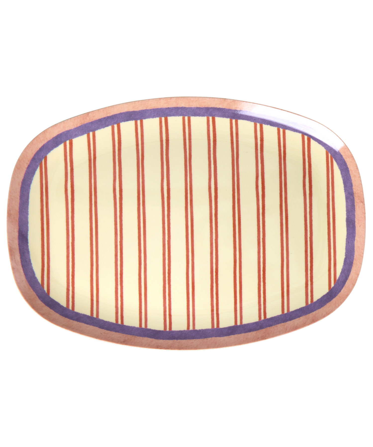 Our rectangular plate in "Stripey Love" print. It’s made of melamine which is durable and ideal for daily use due to its strength and easy cleaning. It makes the plate both practical and unique! Please note that the product is not suitable for the microwave.