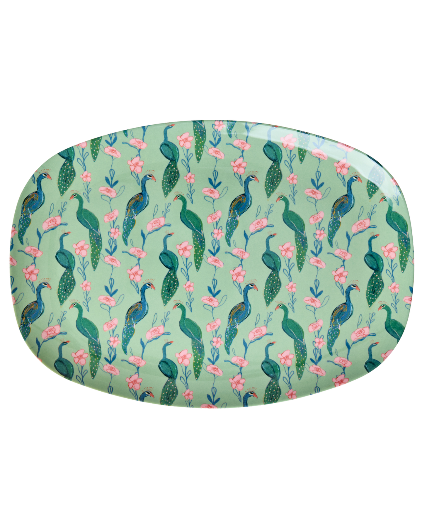 Our rectangular plate in "Peacock Power" print. It’s made of melamine which is durable and ideal for daily use due to its strength and easy cleaning. It makes the plate both practical and unique! Please note that the product is not suitable for the microwave.
