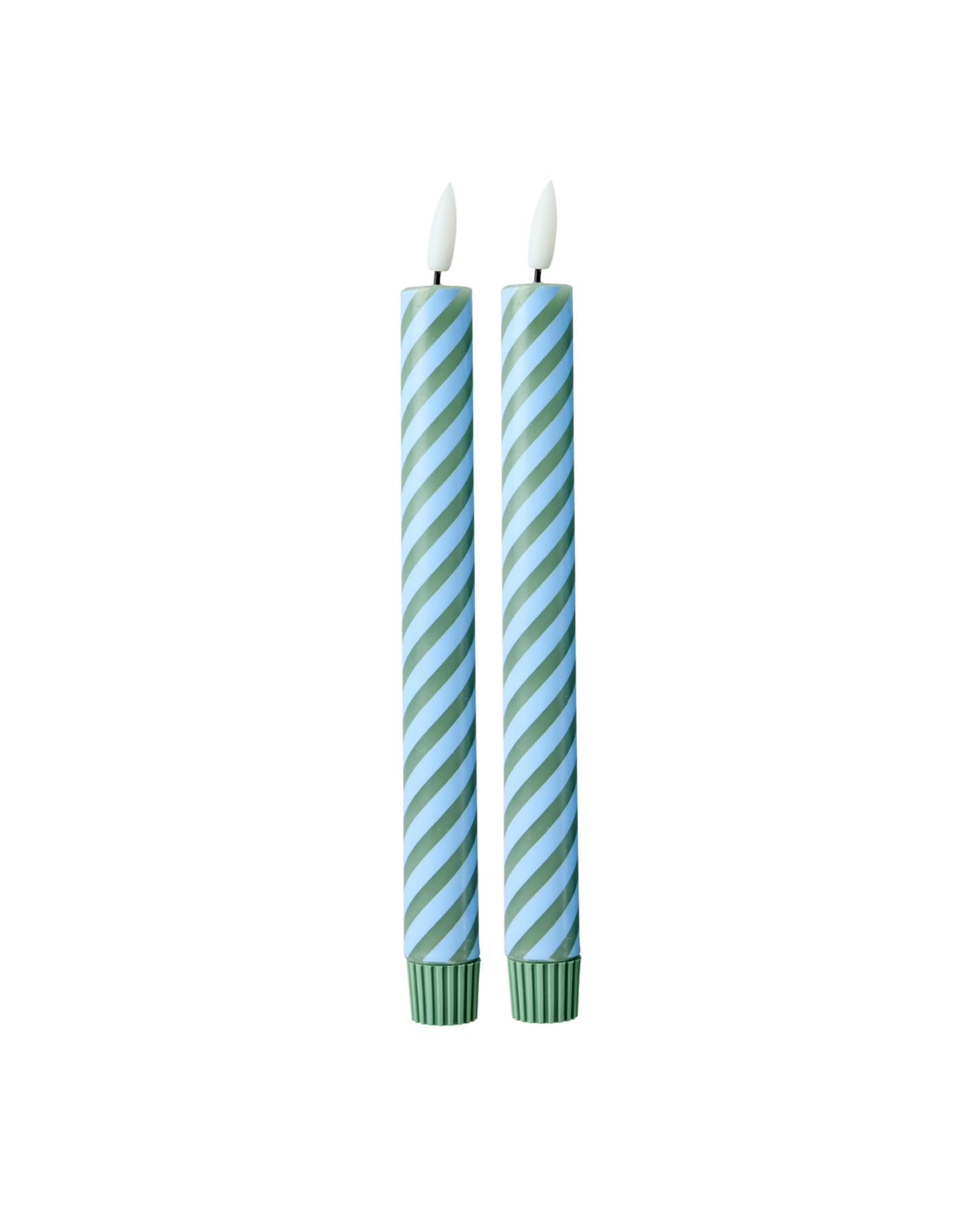The most wonderful LED candles in a beautiful striped color combination – green and blue. The candle comes with a 6-hour timer, come in a set of two, measure 25 cm and will brighten up any room with their flickering lifelike flame… all they need are two AAA batteries (not included).