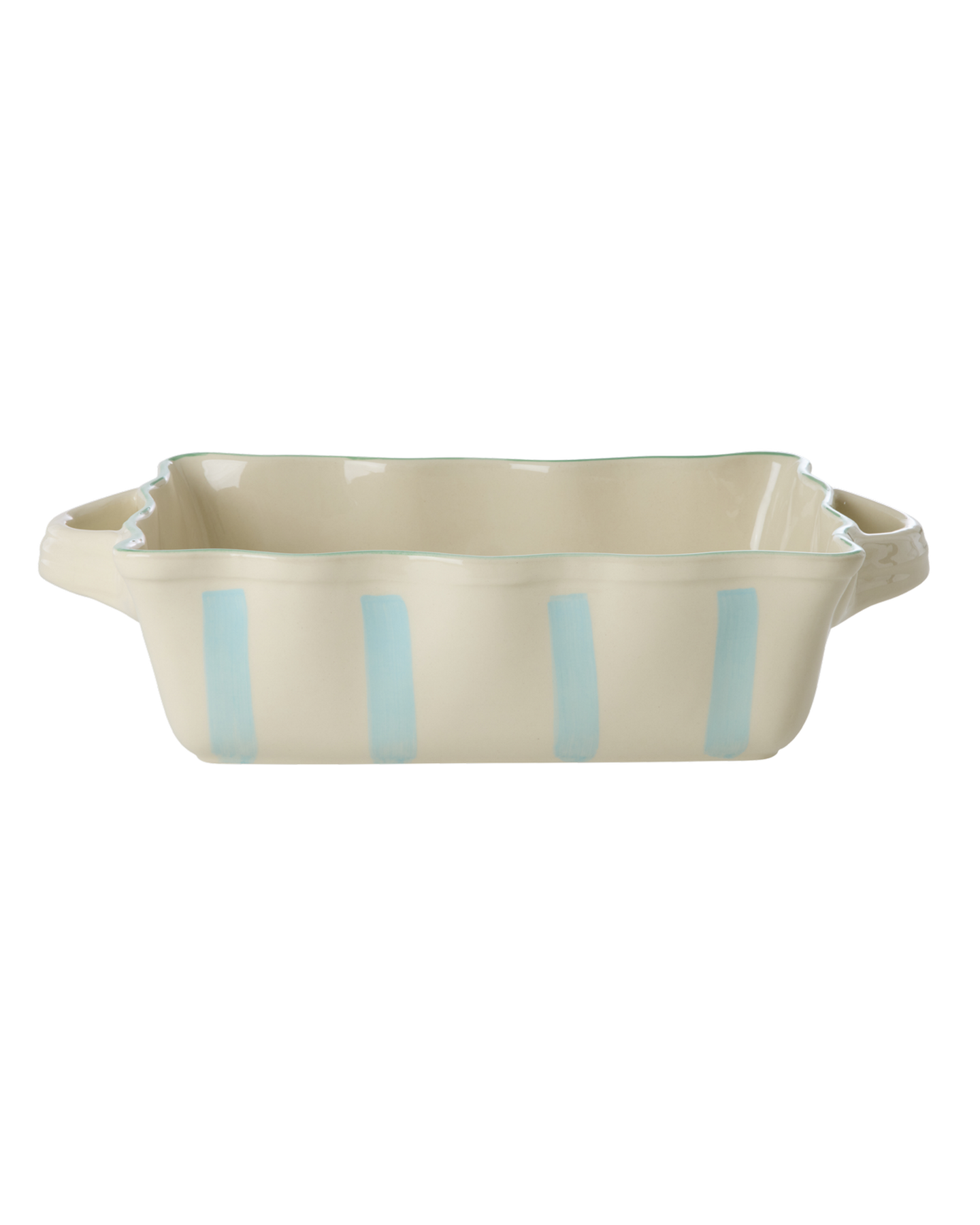 Beautiful, medium stoneware dish… its gorgeous mint-colored stripes and green edges are all hand painted by talented artesian – meaning that each and every dish is completely unique! When buying ceramics, small cracks must be expected over time as the material is 'alive' and will always be 'working'.