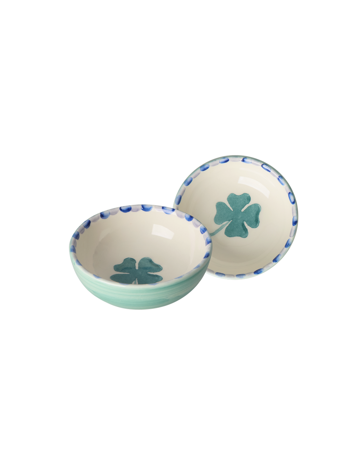 Get lucky with this lovely, dipping bowl featuring a four-leaved clover, a dotted rim and a cute green color on the outside. It is hand-painted in Portugal by a group of amazing women, ensuring that each bowl bears the brush strokes of the hand that painted it. Each individual bowl is therefore completely unique, and we find it so charming!