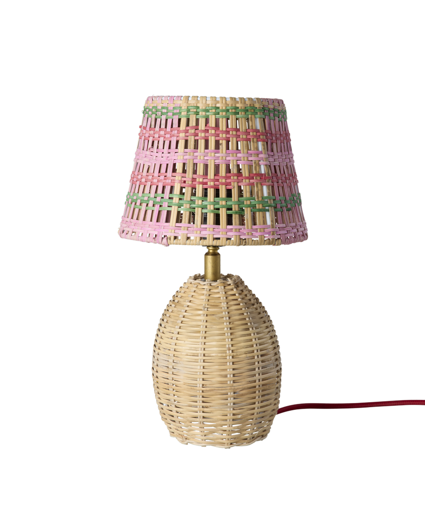 The cutest little table lamp with pink and green stripes. Both the shade and the lamp are handwoven in natural rattan, and the red cord features a practical on/off switch. The cord is fitted with a standard 2-pin plug, making it easy to use in most European outlets. The lamp comes without a bulb and fits an E27 socket.