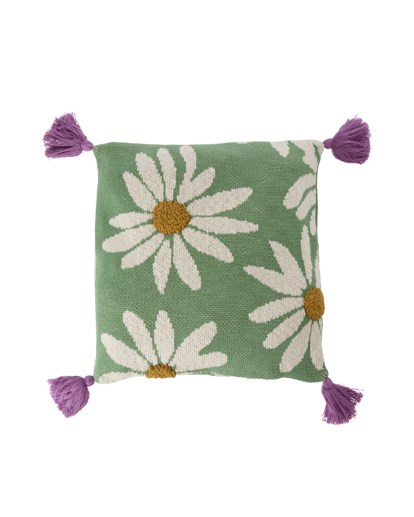Beautiful, green pillow in cotton with a knitted flower design and fun tassels in purple. For a touch of everyday magic place it on the terrace, or simply on the couch in the living room. A colorful pillow like this will create a wonderful vibe. Spot clean only. The pillow measures L40 x W40 cm