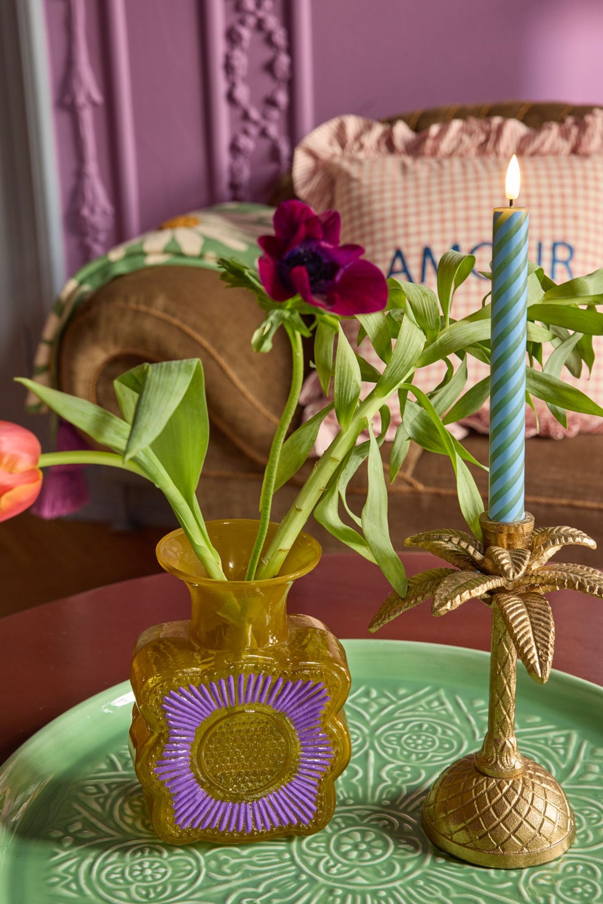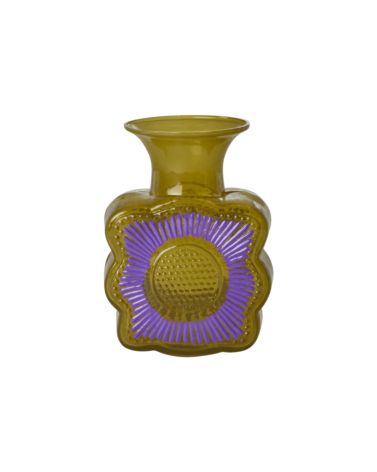 Lovely and quirky little vase in a wonderful curry color with an embossed flower design in purple. It's made of glass and it's perfect for a little bouquet of both fresh and dried flowers!